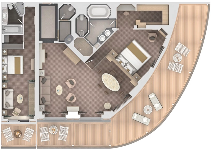 R1 - Royal Suite 1 105 m² (vrátane balkónu). 7. paluba vpredu. Max 3 osoby. 45 300 € 15 100 € za osobu