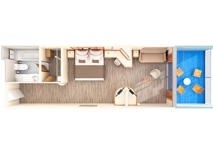 | 8B - Kajuta s balkónom 21,5 - 25,5 m² (vrátane balkóna). 10. paluba stred, vzadu; 11. paluba vpredu, vzadu. | 980 € 490 € za osobu | ||