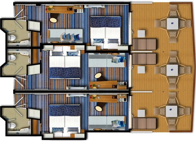 VEPO - Kajuta s terasou Premium 17 m² + balkón 30 m² s 2 kreslami, 2 ležadlami a hojdacou sieťou. 7-11. paluba. Max 3 osoby. 11 158 € 11 158 € za osobu
