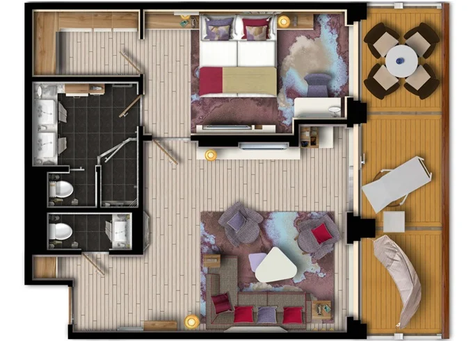 | SUTO - Themen Suite 54 m² + balkón 15 m² so stolom, ležadlom a hojdacou sieťou. Spálňa, obývacia časť, šatník. 14. paluba. Max 4 osoby. Výhody Suite. | 19 196 € 4 799 € za osobu |